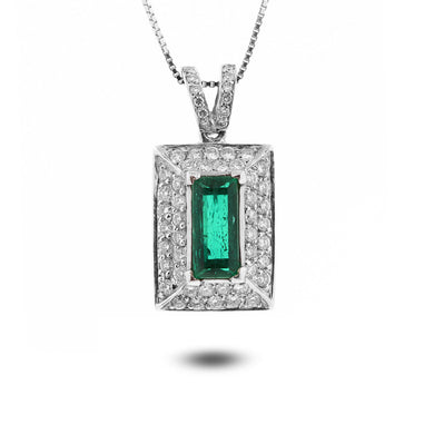 En el centro, una deslumbrante esmeralda ovalada de 0.75 quilates y un delicado halo de diamantes de 0.30 quilates.
