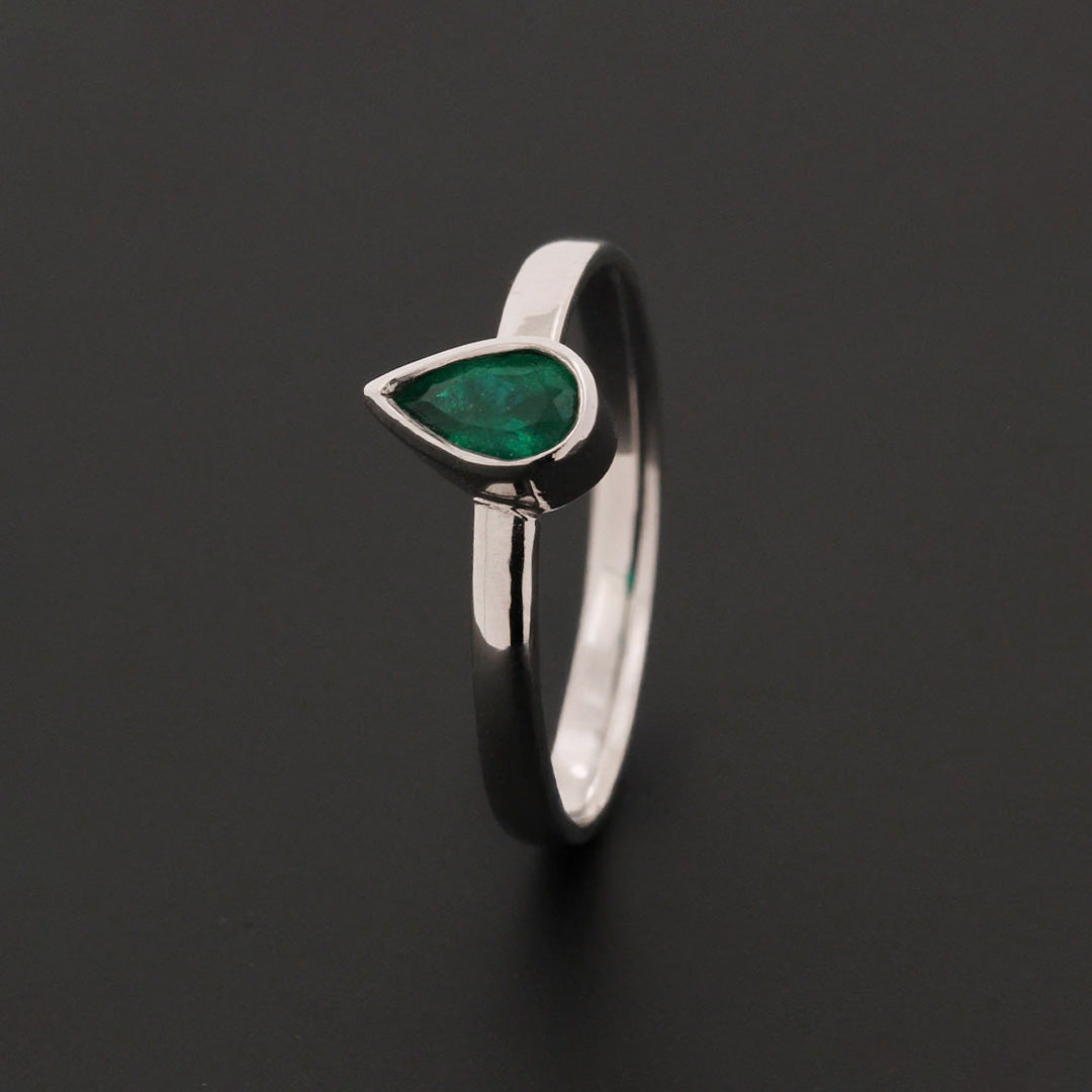 Anillo de oro blanco de 18K con esmeralda colombiana de tono intenso y cristalina de 0.35 quilates tallada en forma lagrima.