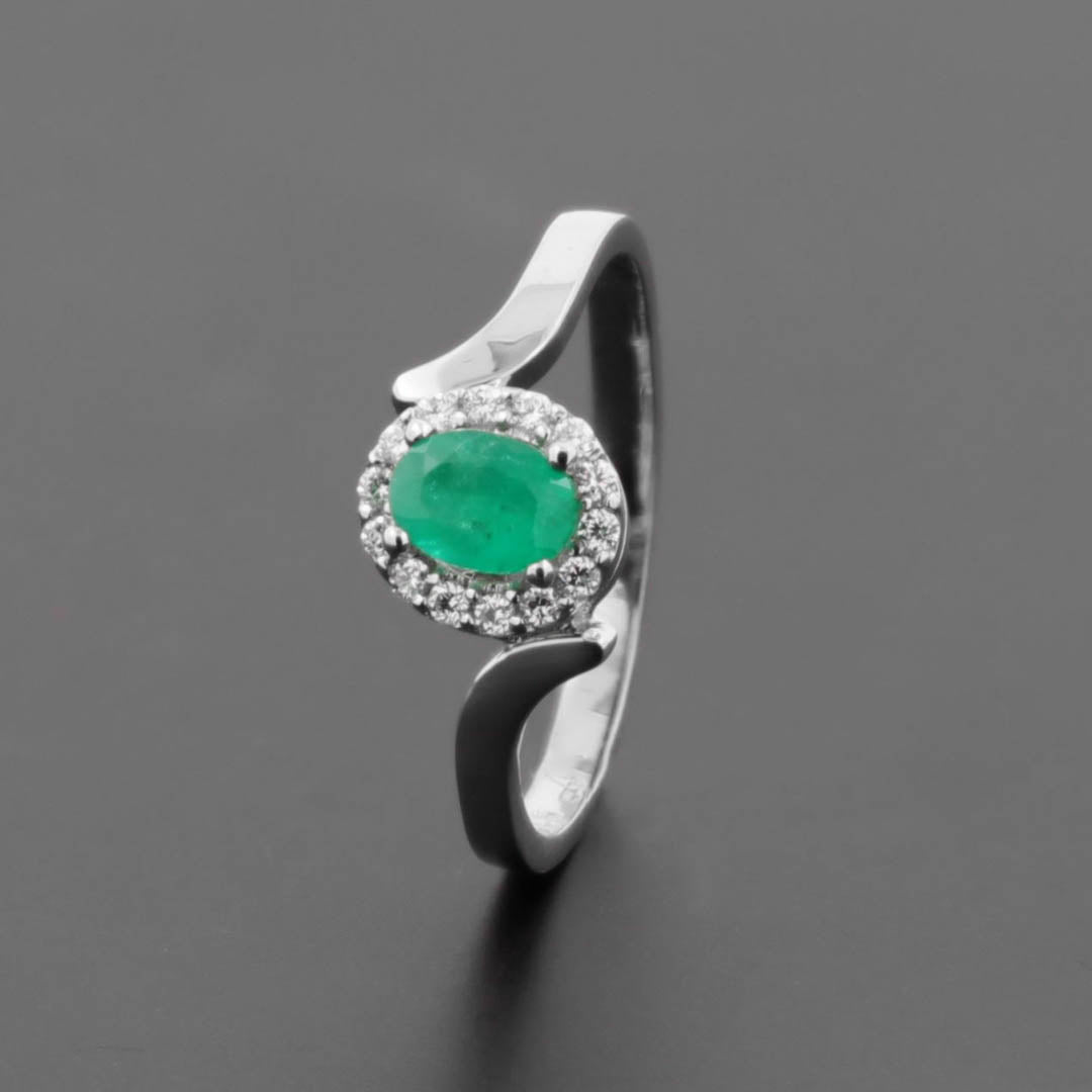Precioso anillo estilo Halo con una Esmeralda central adornada con circones a su alrededor, perfecto ejemplo de elegancia.
