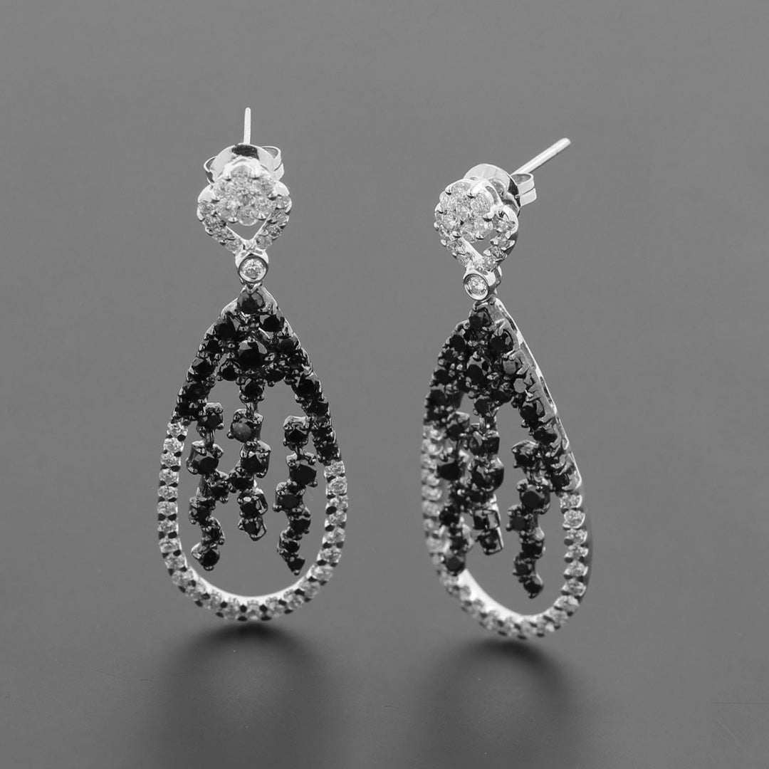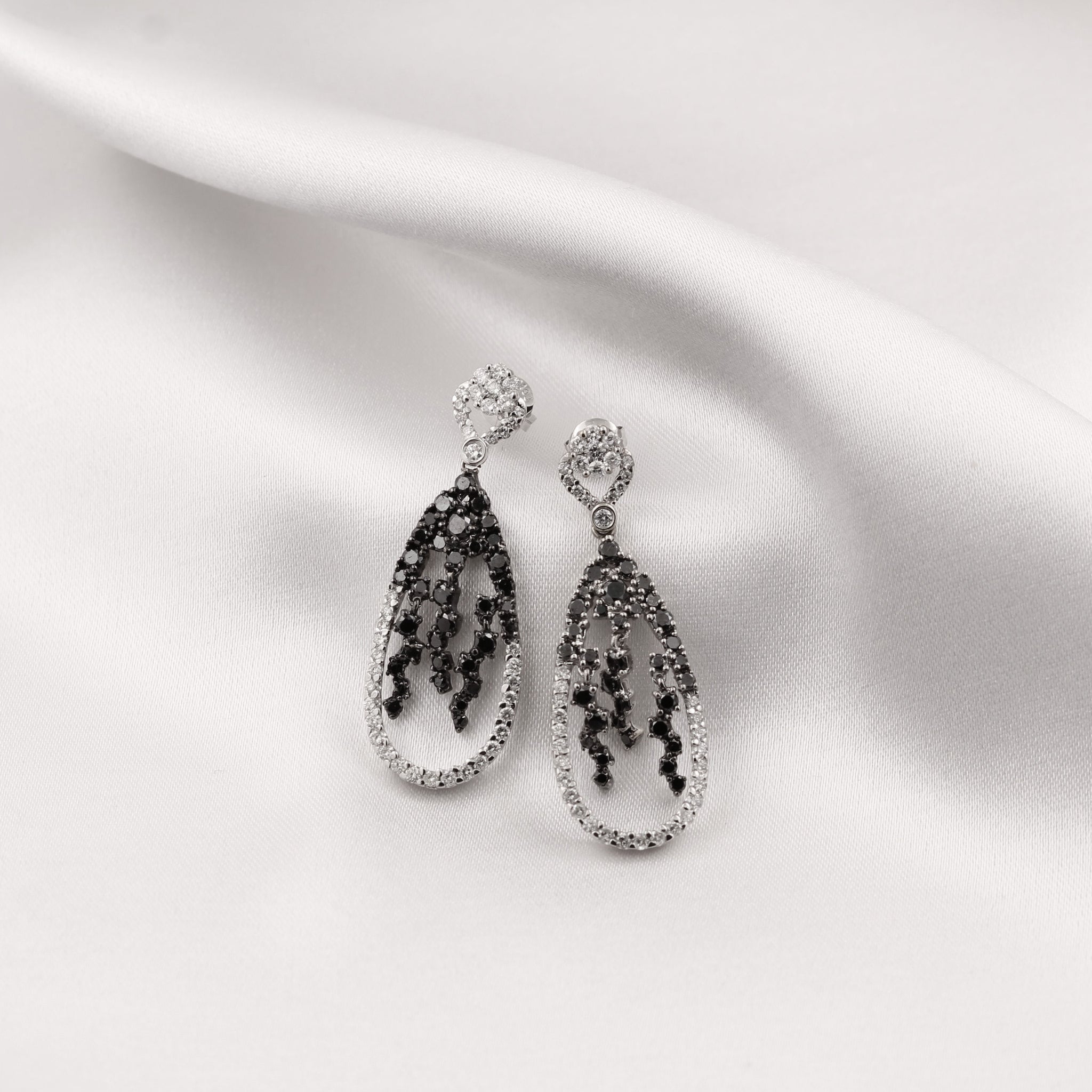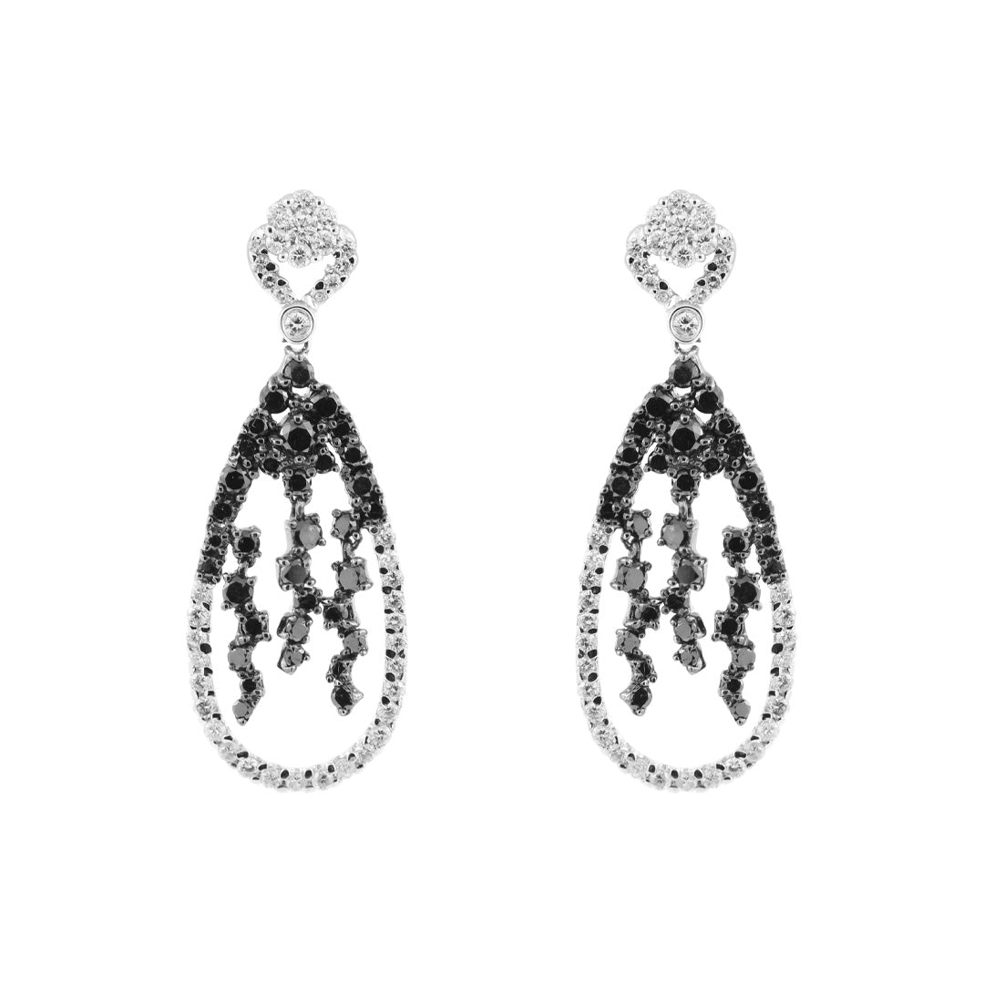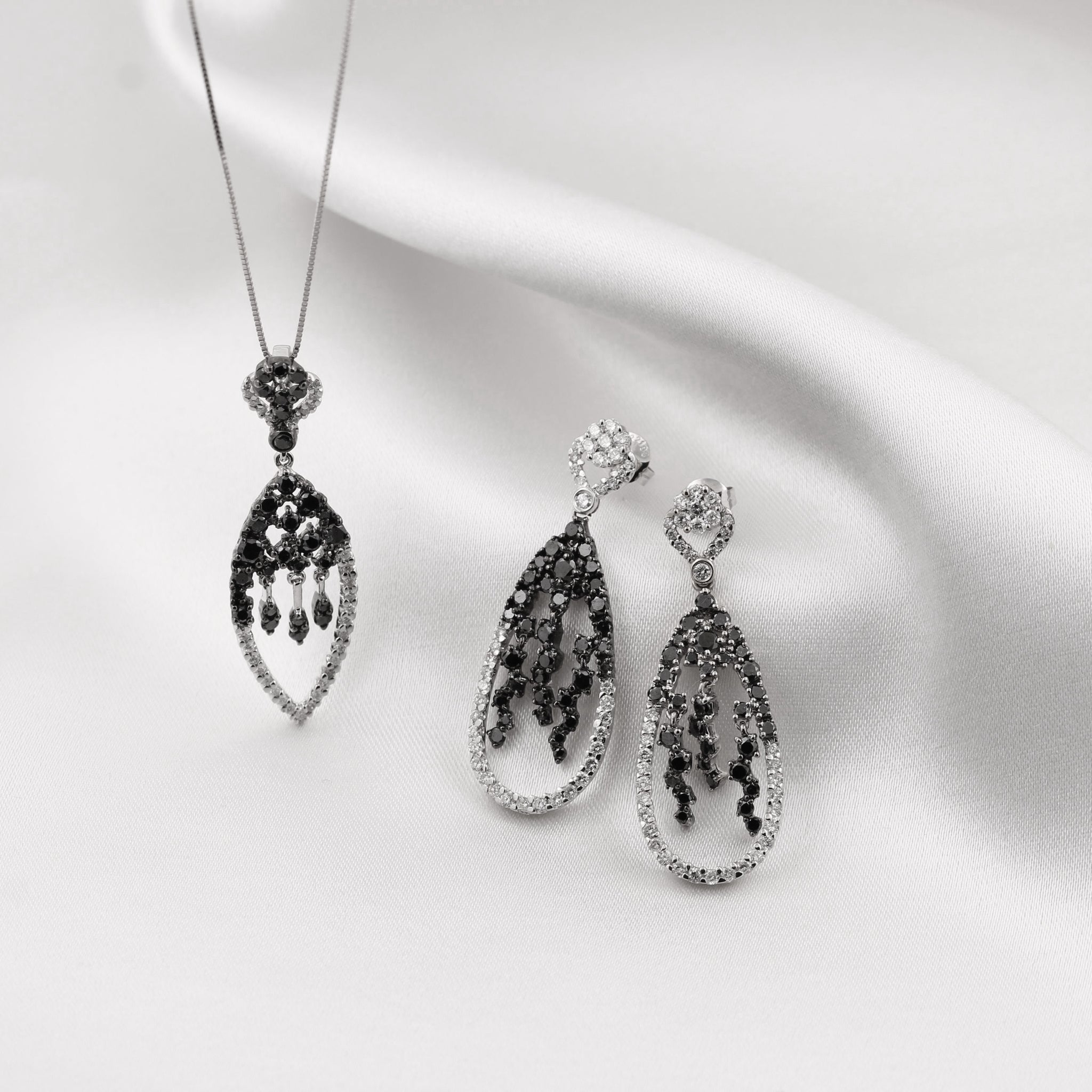 Dije en oro blanco engastado con 0.75 ct de diamantes negros y 0.25 ct de diamantes blancos. Una composición de contrastes audaces y refinamiento absoluto, donde la profundidad del negro realza la pureza de cada destello.
