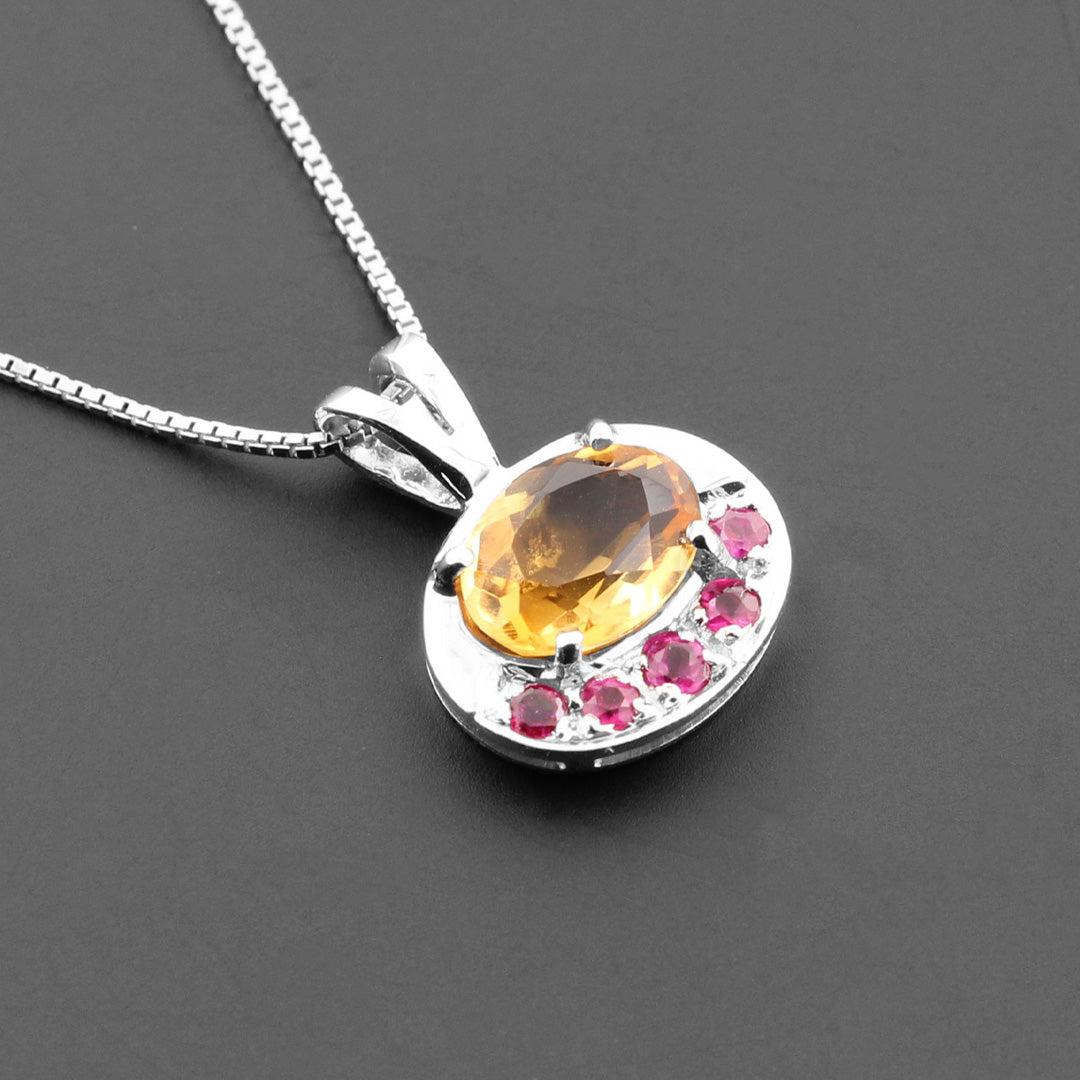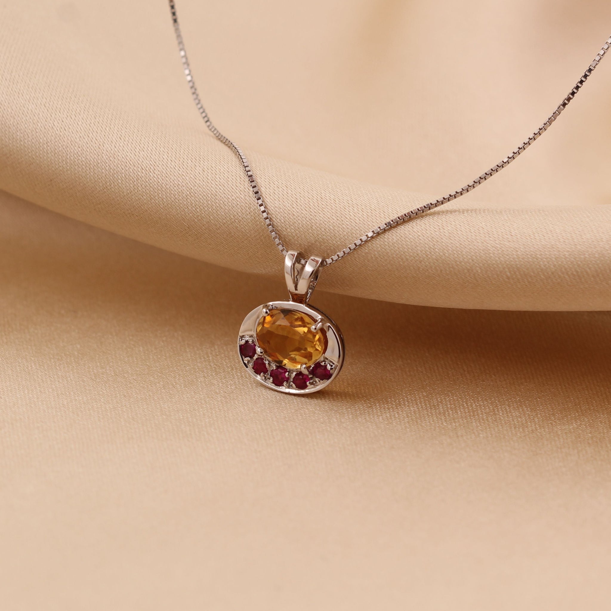 Dije hecho en oro blanco de 18K adornado con citrina de 1.54 quilates y halo de rubíes preciosos con peso total de 0.21 quilates.