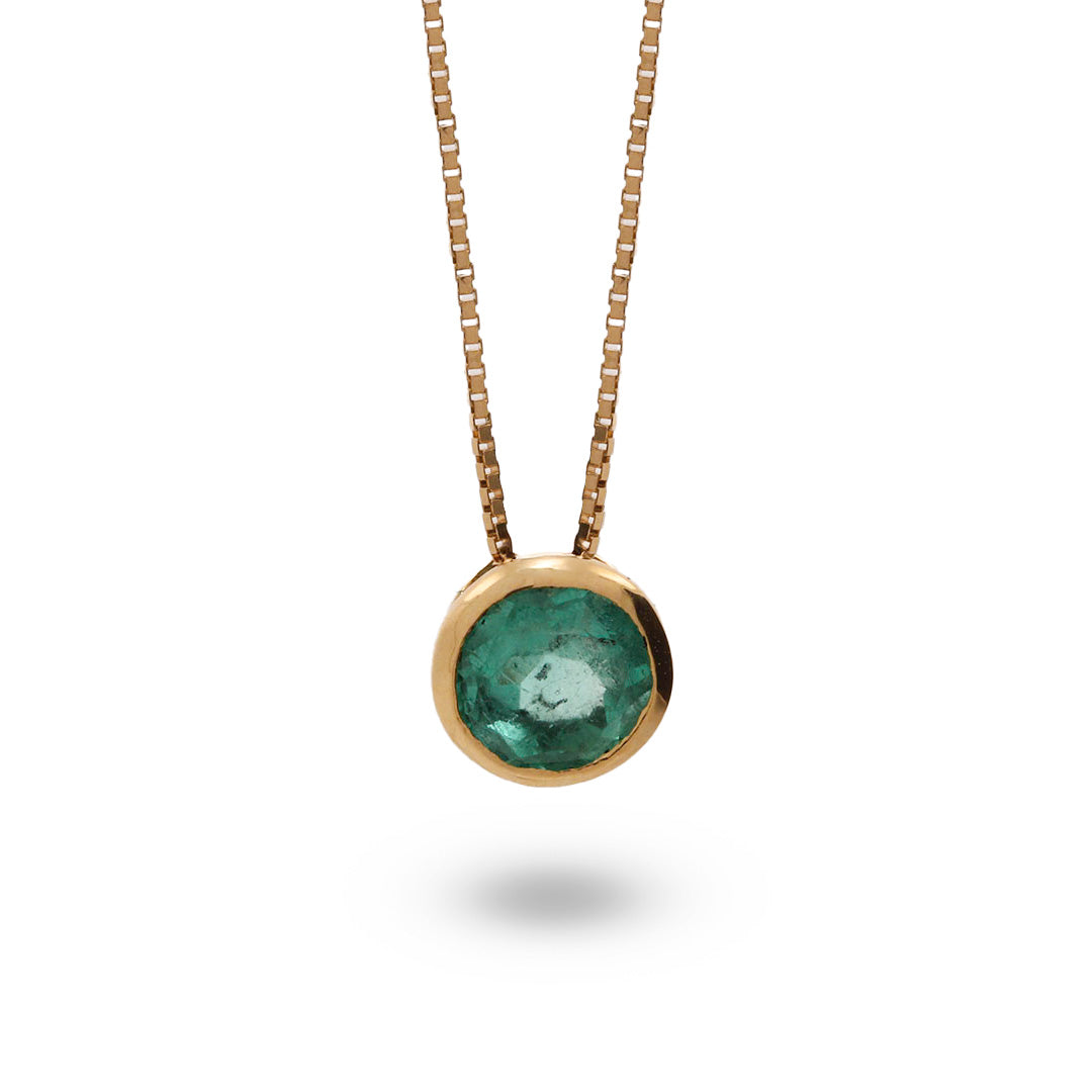Suspendida de una delicada cadena de oro, la esmeralda parece flotar sobre la piel, creando un efecto luminoso y sofisticado. El diseño minimalista permite que la piedra sea la protagonista absoluta, resaltando su color, su brillo natural y su carácter atemporal.