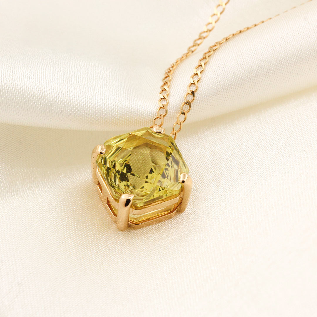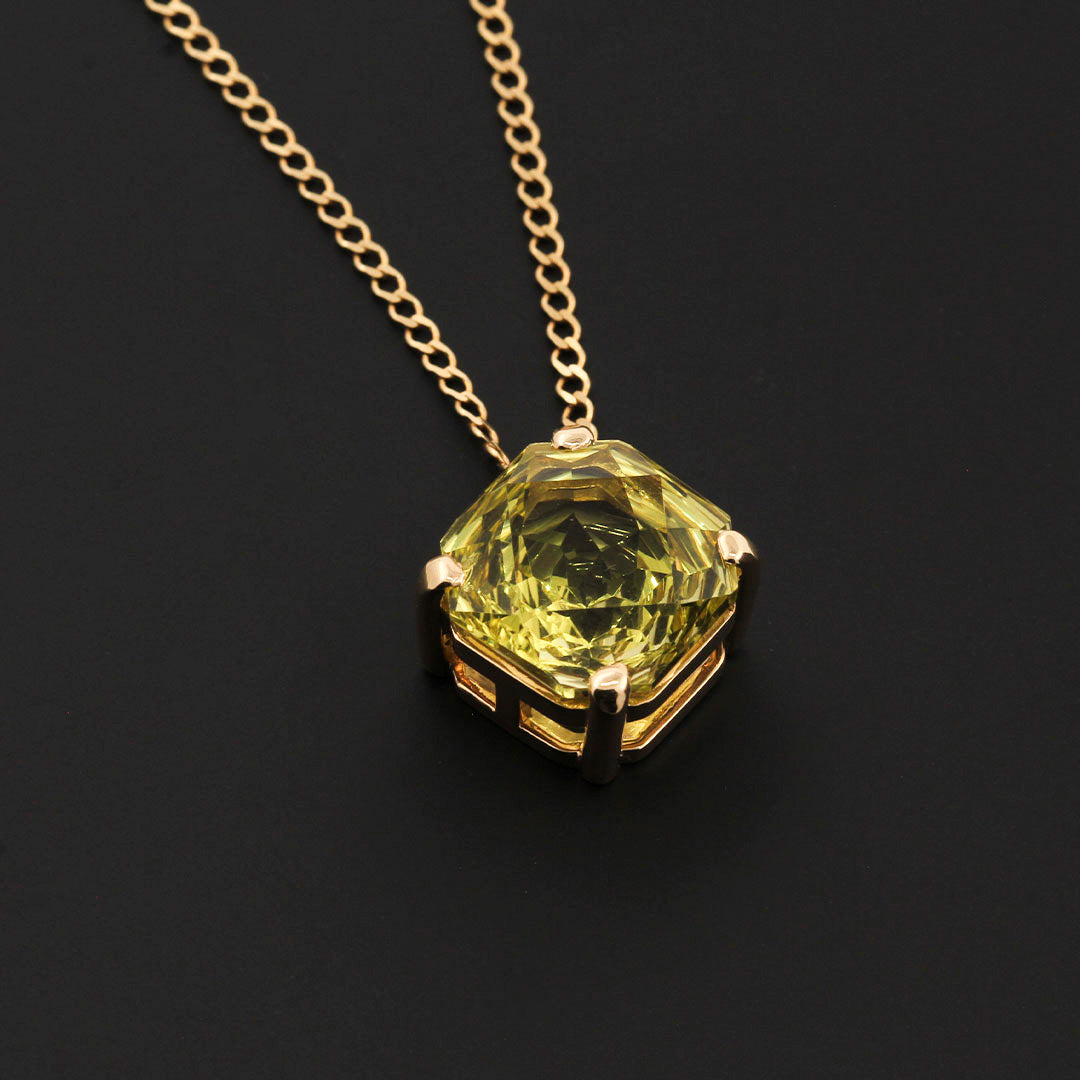 Un cuarzo limón de 9.19 quilates revela un juego hipnótico de destellos dorados en esta pieza protagonizada por la luz. Su talla geométrica crea una profundidad interior que parece vibrar desde el centro, mientras una montura en oro realza cada faceta con precisión arquitectónica.