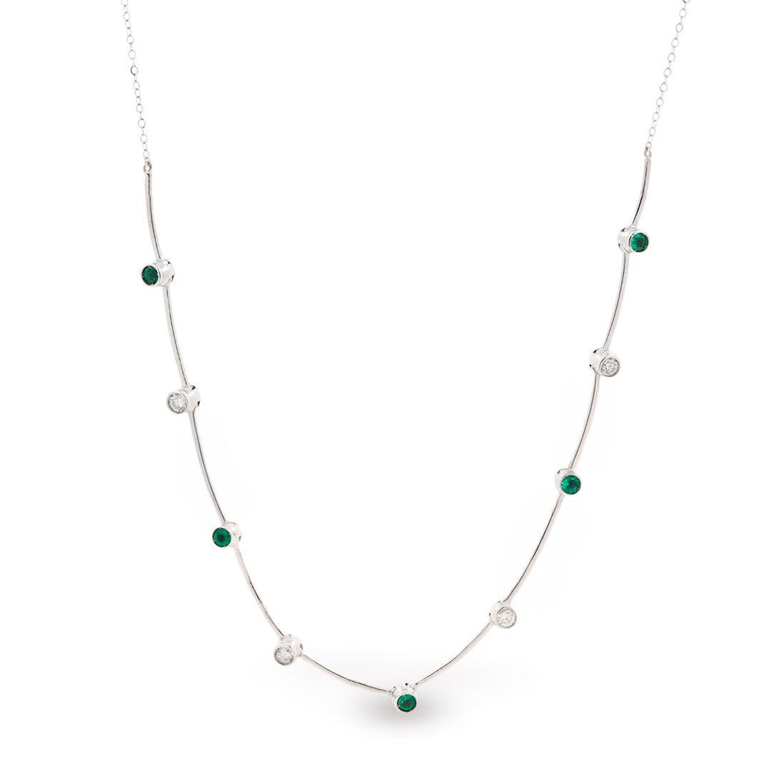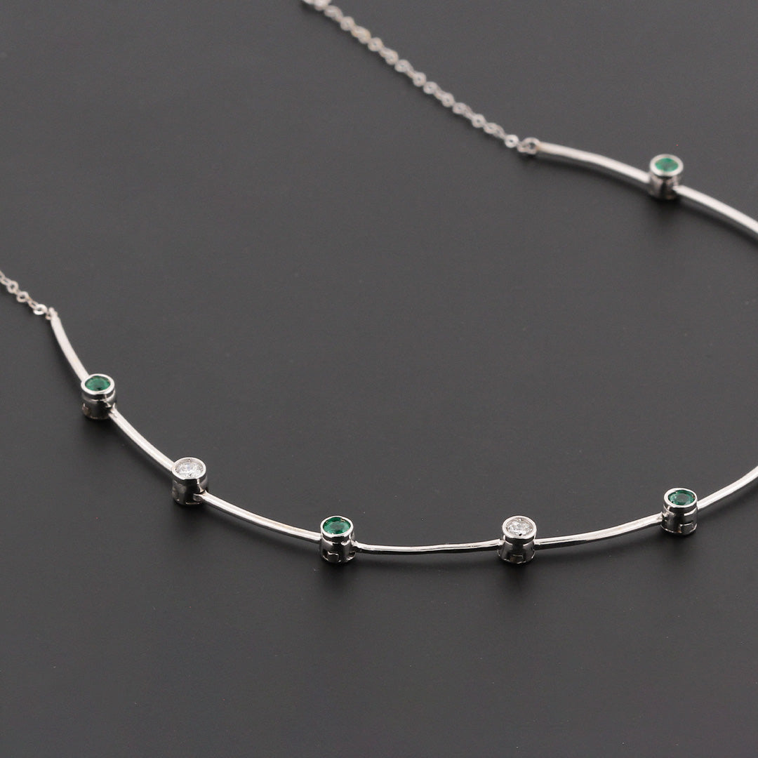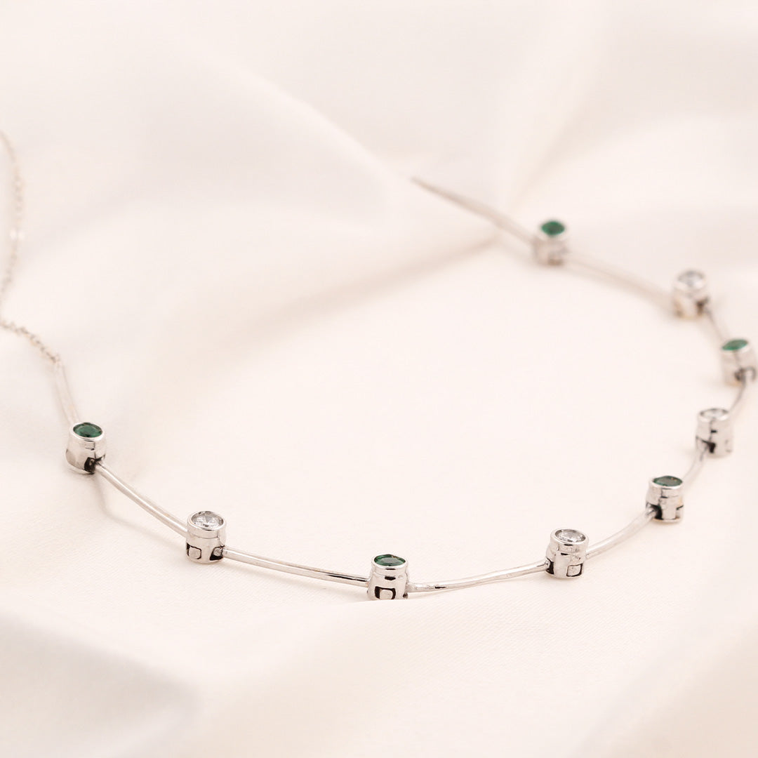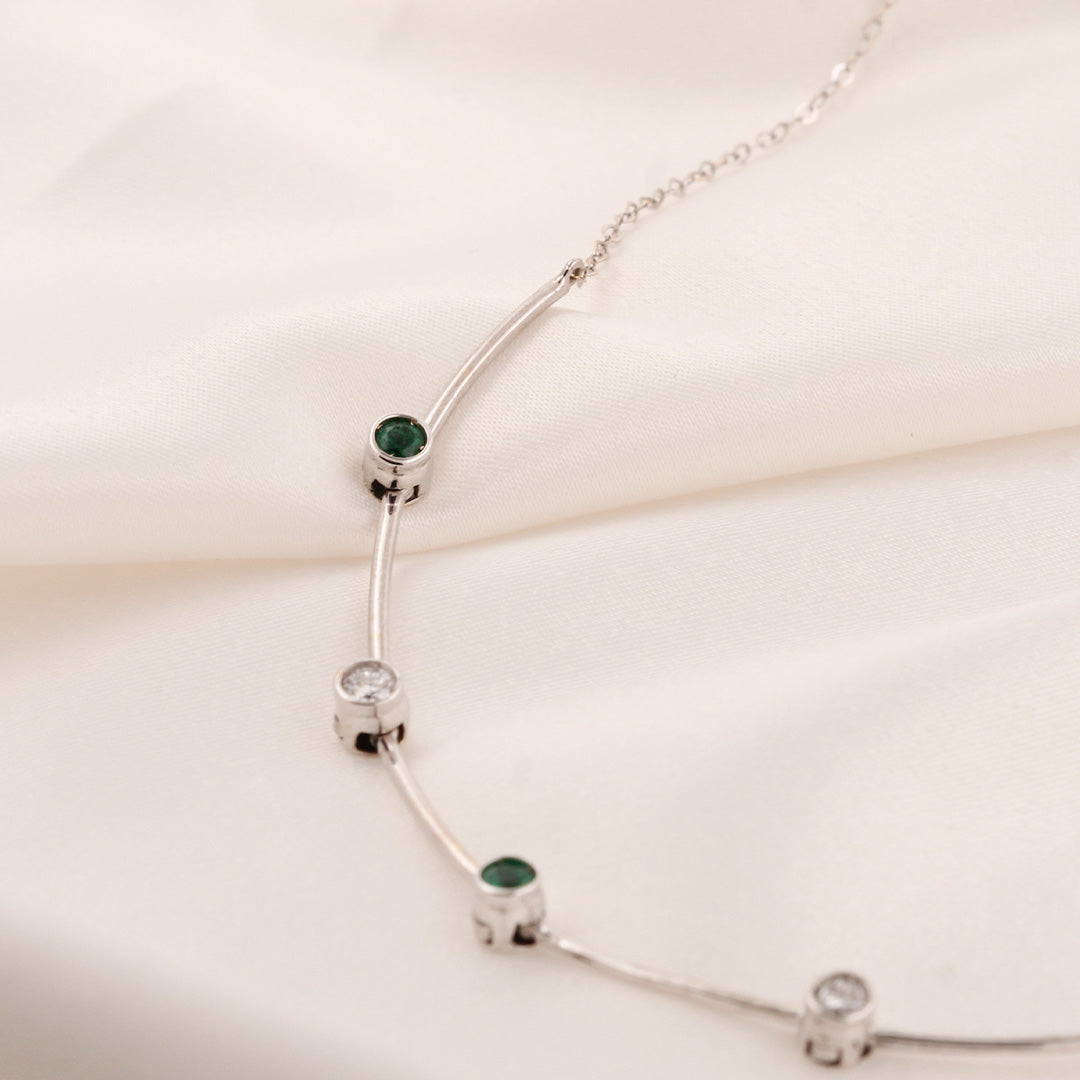 A lo largo de la pieza, 0.5 ct de esmeraldas se alternan con 0.6 ct de diamantes, engastados de manera precisa para crear un diálogo equilibrado entre color y luz. Las esmeraldas aportan profundidad y frescura; los diamantes, destellos sutiles que acompañan el recorrido sin interrumpir la fluidez del diseño.