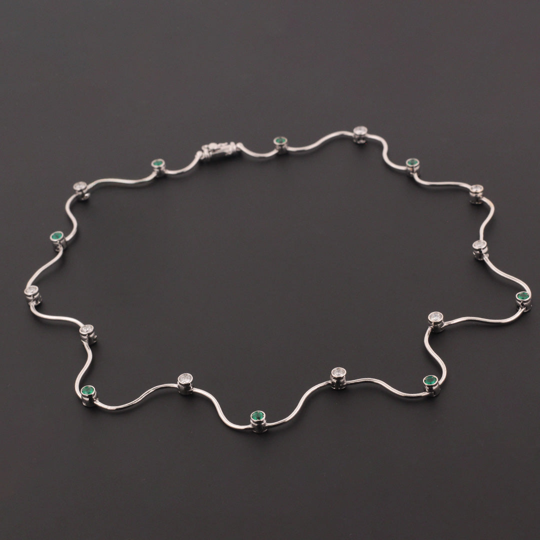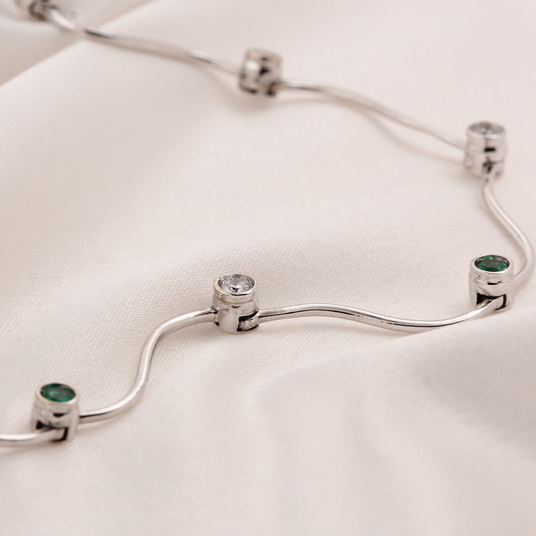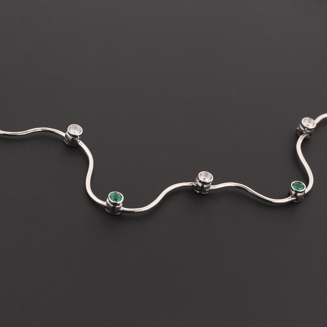A lo largo de la estructura, 1 ct de esmeraldas se intercalan con 1.35 ct de diamantes, engastados de manera precisa para construir un juego equilibrado entre color y luz. Las esmeraldas aportan profundidad y frescura; los diamantes, destellos constantes que acompañan el movimiento natural de la pieza.