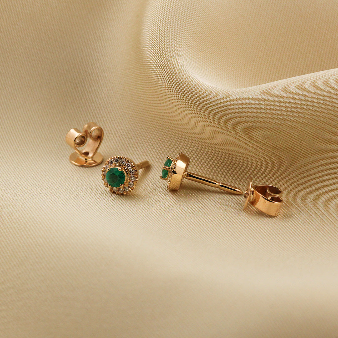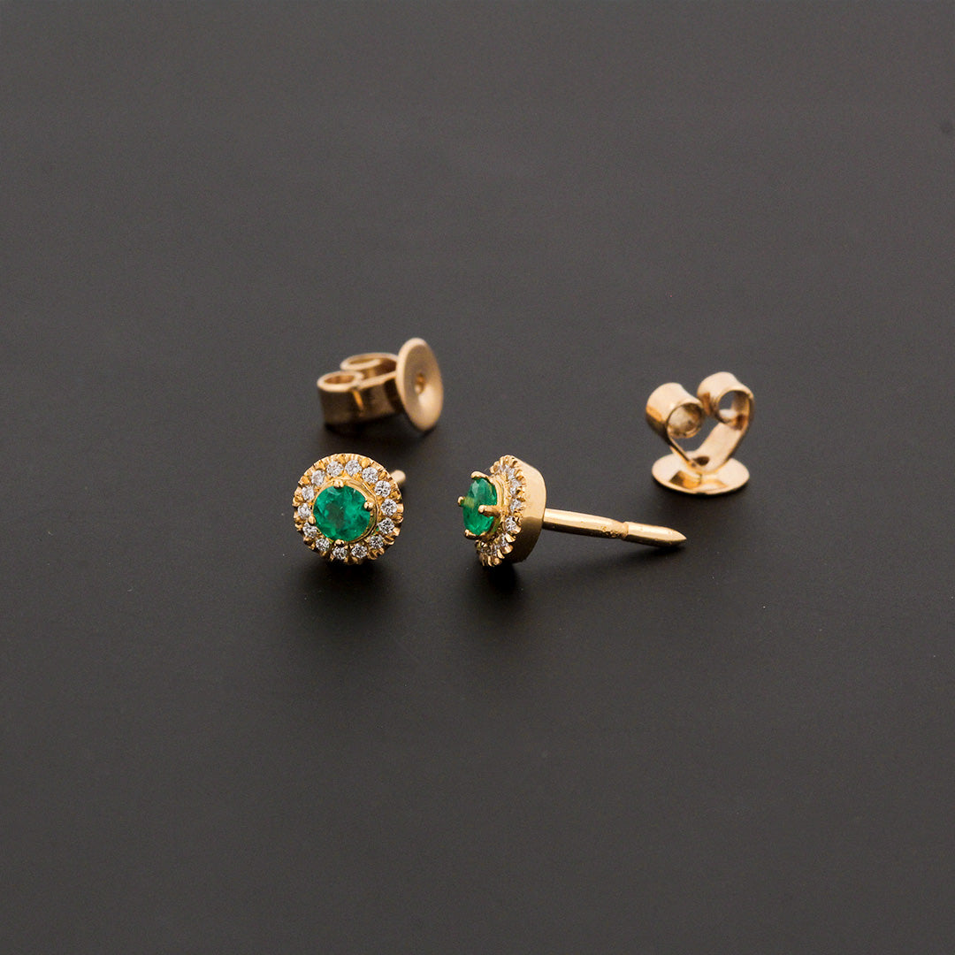 Los aretes Avel están elaborados en oro de 18 quilates y presentan una esmeralda central de 0.25 ct, cuidadosamente seleccionada por su tono verde profundo y su claridad natural. La piedra se enmarca con un delicado halo de 0.17 ct en diamantes, engastados con precisión para potenciar el brillo sin restar protagonismo a la esmeralda.
