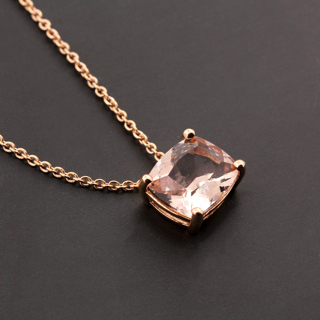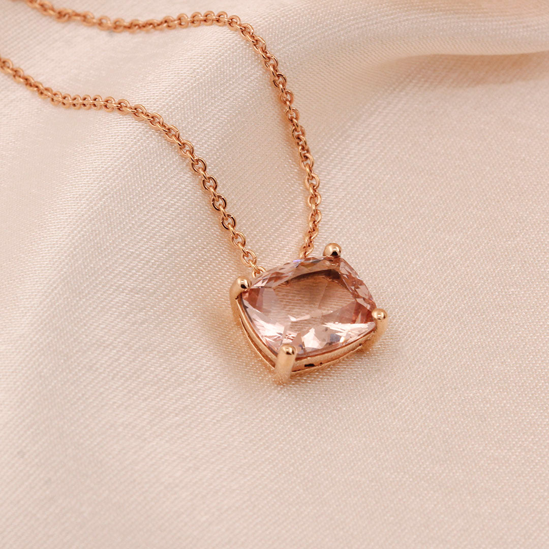 Este dije presenta una morganita de 4.85 ct, tallada en un corte cushion que combina ángulos precisos con una curvatura delicada, permitiendo que la luz se deslice por cada faceta con una calidez envolvente. Su tono rosa melocotón —sutil, elegante y eternamente femenino— refleja la esencia luminosa de Bahía: la serenidad dorada del atardecer sobre el mar.