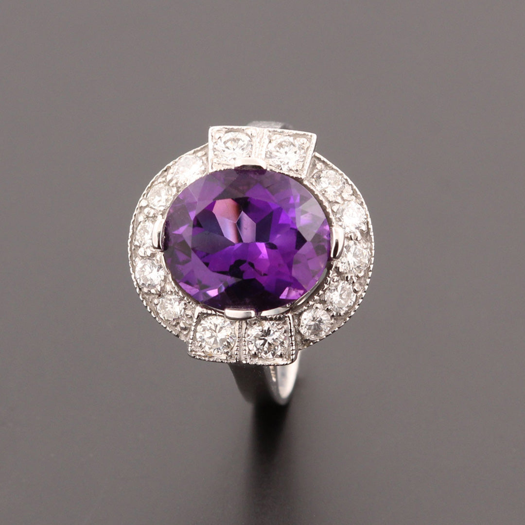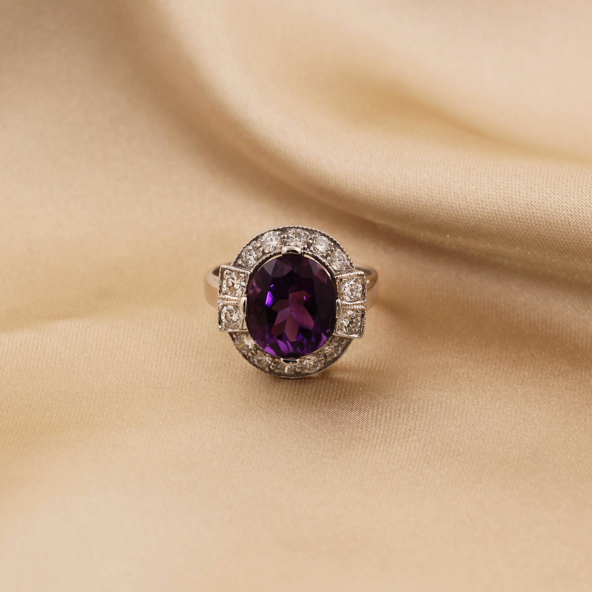 Anillo de oro blanco 18k con amatista central de 3.37ct y 0.75ct de diamante de adorno.