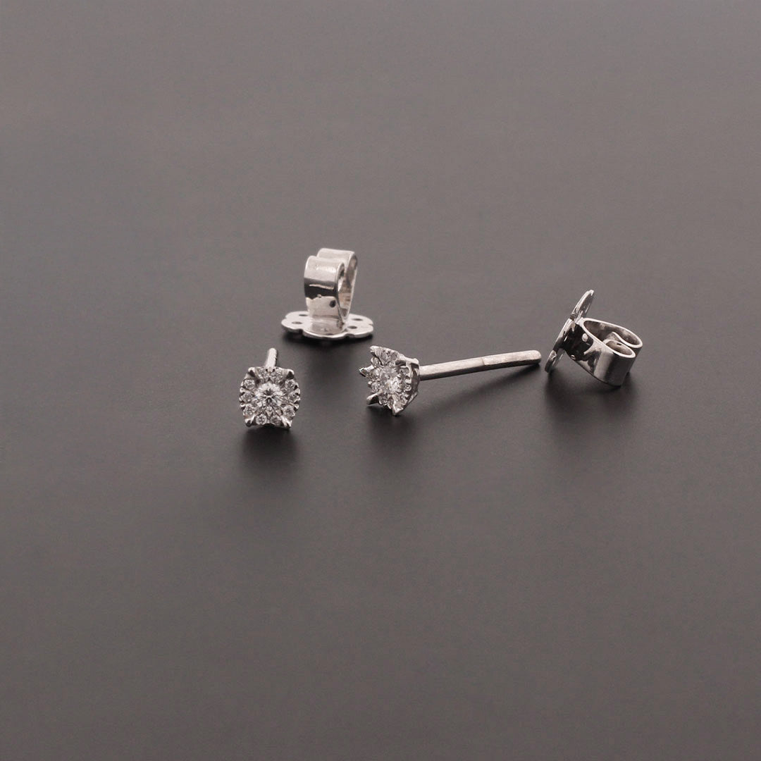 Estos delicados aretes en oro blanco 18k presentan un diamante natural de 0.012 ct, realzado mediante un engaste de efecto ilusión que amplifica visualmente el brillo y el tamaño de la gema. El resultado es una luz más amplia, más viva, que se percibe con la discreción y refinamiento propios de la alta joyería.